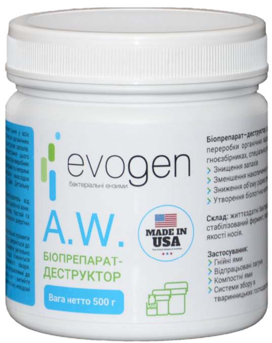 Для приготування робочого розчину необхідно 1.5 кг EVOGEN A. W. додати до 500 л чистої нехлорованої води. Залишити розчин на 24 години та вилити весь об’єм в лагуну-гноєзбірник через дренажну лінію.