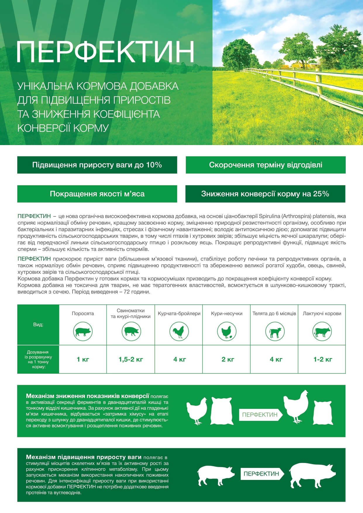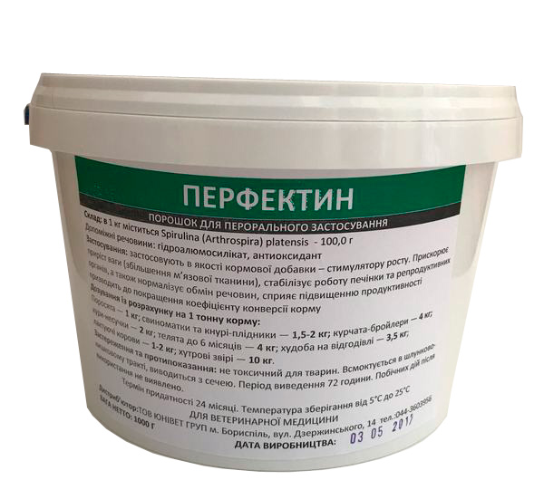 Перфектин – це нова високоефективна кормова добавка, на основі ціанобактерії Spirulina (Arthrospira) platensis, що сприяє нормалізації обміну речовин, кращому засвоєнню корму, зміцненню природної резистентності організму, особливо при бактеріальних і паразитарних інфекціях, стресах і фізичному навантаженні; володіє антитоксичною дією; допомагає підвищити продуктивність та зберегти поголів’я сільськогосподарських тварин, в тому числі птахів і хутрових звірів; збільшує міцність яєчної шкаралупи; оберігає від передчасної линьки сільськогосподарську птицю і розкльову яєць.